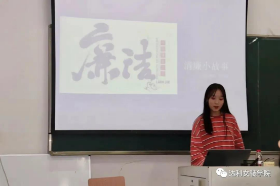 为全面提高大学生的思想道德素质,建立健全拒腐防变教育长效机制,积极响应我校第二届“清廉文化建设月”活动,丰富大学生的校园文化生活,普及廉洁知识,提高廉洁素养,达利女装学院在2020年11月9日在7501举办了“清廉故事说”PPT主题演讲比赛。达利女装学院党总支纪检委员、学工办主任祝丽霞,学生党支部书记、团总支副书记柳霆钧出席了本次比赛并担任评委,78位选手参加比赛。