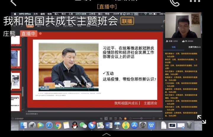 晚上八点,直播准时开始,庄熊以振奋人心的抗疫歌曲作为背景音乐,用当前同学们最关心的话题和热点开始了课程。接着,他从“勿忘来时路”、“感念创业艰”、“新时代新青年”、“同心战疫”四大主题,通过生动的案例故事、影像资料,真情实感的讲述,与同学们共同回顾了新中国成立70多年来的风雨历程和伟大成就。引导同学们回忆在个人成长过程中记忆深刻的大事件,坚定他们的爱国之情、家国情怀,号召他们牢牢树立起历史使命感和时代责任感。班会课最后,与同学们在线共同学习了《习近平:在统筹推进新冠肺炎疫情防控和经济社会发展工作部署会议上的讲话》,解读了国家的决策部署、分析中国抗疫彰显的中国共产党领导和中国特色社会主义制度的显著优势将必胜的信念和青春的担当传递到每一位同学心中。