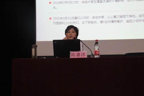 讲座中,陈老师从危及生命事件、刑事案件;突发疾病、心理健康与意外受伤;交通事故;网络诈骗与民间借贷;盗窃案件等5个方面列举了安全事故的危险性,并就这些存在的安全问题提出了很多解决的方案和防范的措施。