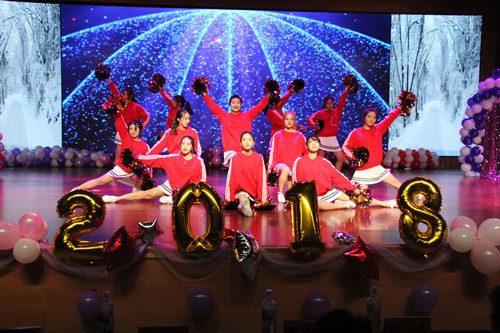 晚会现场布置喜庆热闹,节目精彩粉呈。迎宾处还设置了红包墙,扫码就有机会领红包,令同学们很是激动。达利文艺部的开场舞又劲又燃,晚会迅速暖场。今年的新年晚会节目风格多变,歌曲、舞蹈、古筝伴舞、音乐剧、心理剧、萨克斯独奏、国防作战表演等应有尽有。师生同台表演的《纱舞扎染》清丽脱俗、别具一格,富含浓浓的专业文化特色,让人为之眼前一亮。穿插全场的抽奖与游戏环节激动人心,一次次点燃了全场的热情。学生会大合唱《同一首歌》、《歌唱祖国》将十九大精神与新时代力量化作砥砺人心的歌声。模特社将丝巾文化与走秀相融合,火辣演绎了丝巾秀,令观众眼花缭乱、美不胜收。
