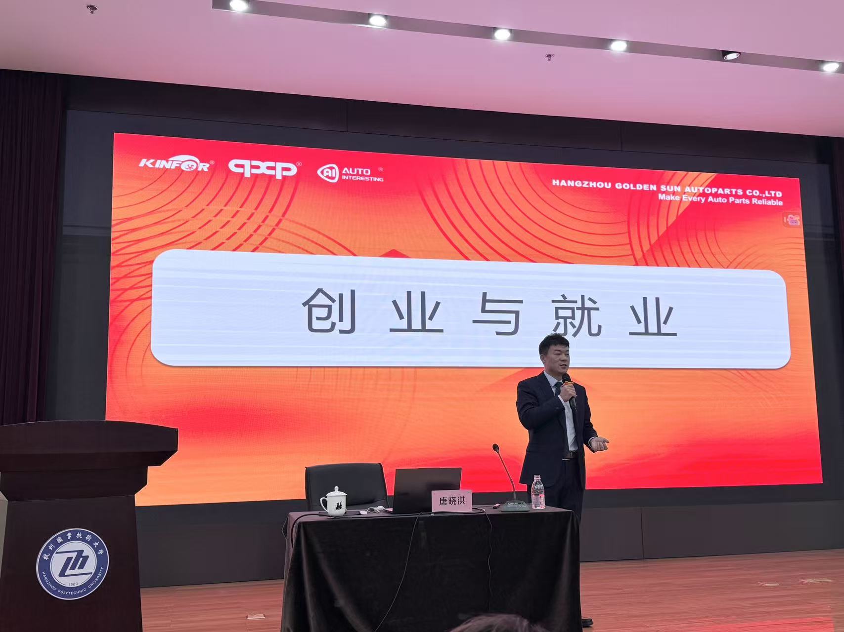 12月9日下午,杭州职业技术大学行政楼二楼报告厅座无虚席。学校特邀1996级杰出校友、杭州金日汽车零部件有限公司董事长唐晓洪,以“职业与人生”为主题开展专题讲座。学工部部长江平、副部长张园园,达利女装学院院长郑小飞、党总支书记王天红、副院长刘桠楠,副书记刘富海出席分享会。会议由刘富海主持。