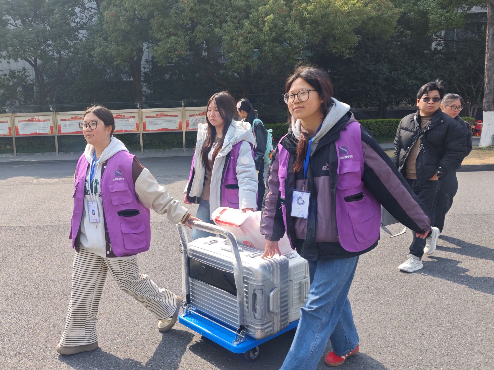 返校当日,志愿者早早到岗,分布在校门、宿舍区等关键区域。他们协助搬运大件行李,维护现场秩序,一抹抹“达利紫”成为校园温暖风景。整个过程中志愿者们各司其职,现场秩序有条不紊,忙而不乱,为同学们安全返校提供有力保障。