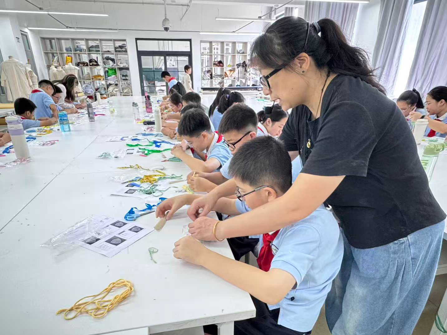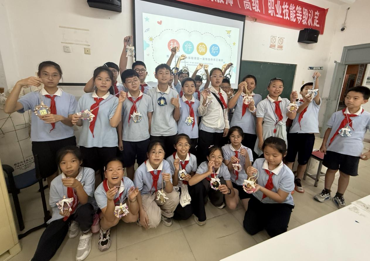 活动中,专业教师马旖旎和朱琪通过生动的讲解和作品展示,为同学们揭开了手工编织艺术的神秘面纱。普通的彩绳在指尖交缠,化身为寓意吉祥的中国结与精巧的挂饰。这一过程所蕴含的耐心、专注与智慧,深深吸引了在场的每一位小同学。在实践环节,教室里顿时化身为一个热闹的“手工坊”。在老师们手把手的教学下,小同学们从生疏到熟练,从模仿到创新,全神贯注地投入到编织世界中。